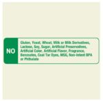 - No gluten, yeast, wheat, milk or milk derivatives, lactose, soy, sugar, artificial preservatives, artificial color, artificial flavor, fragrance, benzoates, coal tar dyes, MSG, non-intent BPA, or phthalate